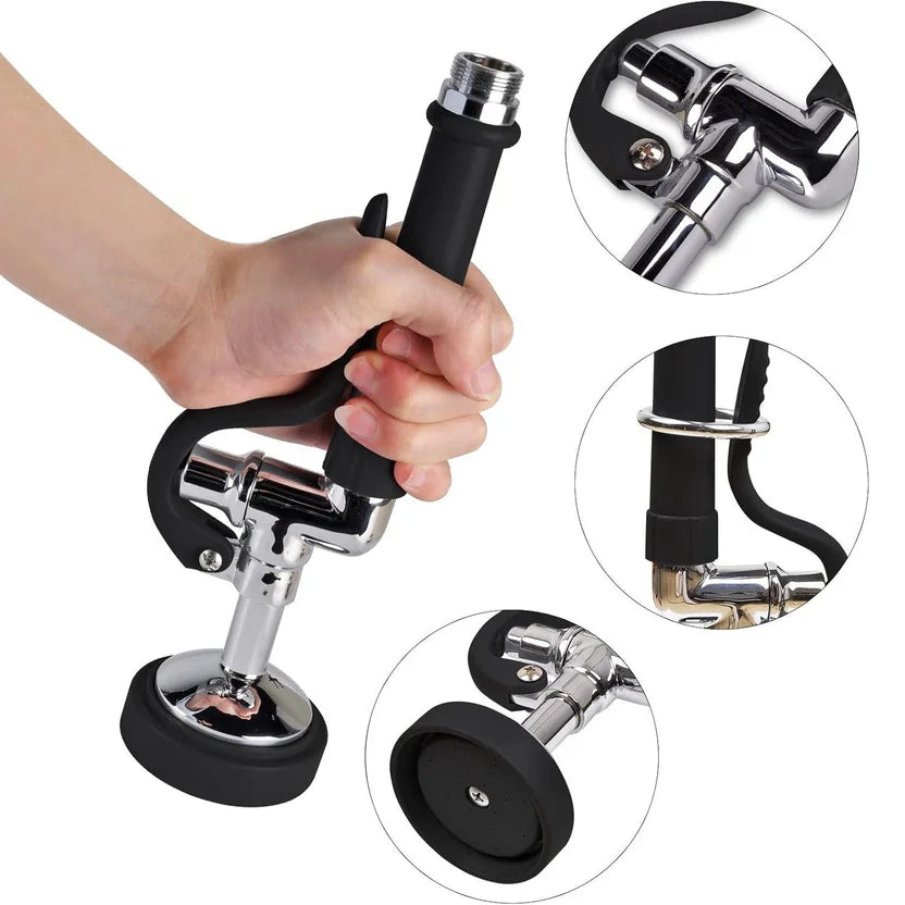 El sistema de doble cabezal independiente permite usar cada chorro de agua en una poceta distinta, optimizando el lavado y reduciendo tiempos de operación. Su manguera flexible y cabezal móvil brindan libertad de movimiento y facilidad para limpiar utensilios grandes o zonas de difícil acceso.