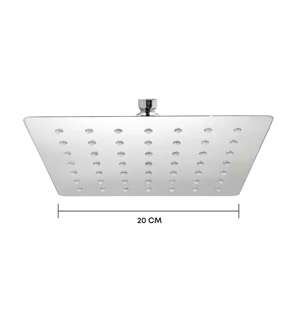 Ducha regadera metálica extraplana fabricada en acero brillado con racor de enrosque en bronce y filtro de sedimentos Su diseño cuadrado de bordes ultra delgados permite disfrutar de un chorro tipo lluvia sin necesidad de alta presión Mide 20 x 20 cm con un brazo a muro de 40 cm La compra incluye el brazo de instalación la regadera y el escudo a pared Cuenta con garantía de 2 años Para su instalación no es necesario el uso de herramientas como pinzas o alicates ya que podrían dañar el acabado en cromo está diseñada para instalarse de manera manual Si vives en zonas con alta sedimentación de agua se recomienda limpiar el filtro de tamizado cada seis meses Los productos adicionales como mezclador de ducha y tele-ducha hacen parte de la ambientación y se venden por separado.