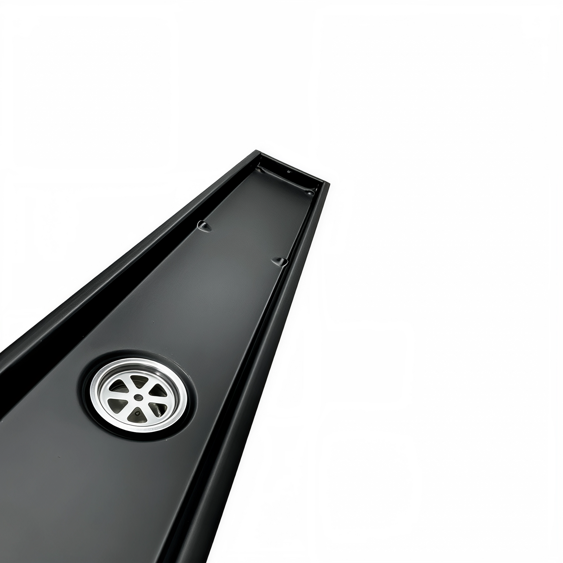 Rejilla invisible para piso fabricada en acero de alta calidad con acabado negro mate diseño moderno y minimalista que se integra de forma elegante en baños cocinas y áreas de lavado cuenta con filtro de gran eficacia para retener cabello y otros desechos garantizando un drenaje limpio y eficiente con tamaño de 80 x 10 cm se instala de manera sencilla y ofrece durabilidad y resistencia en su uso diario desagüe en el centro de la canastilla que asegura un óptimo flujo de agua garantía de tres meses por color y un año por defectos de fábrica en su funcionamiento