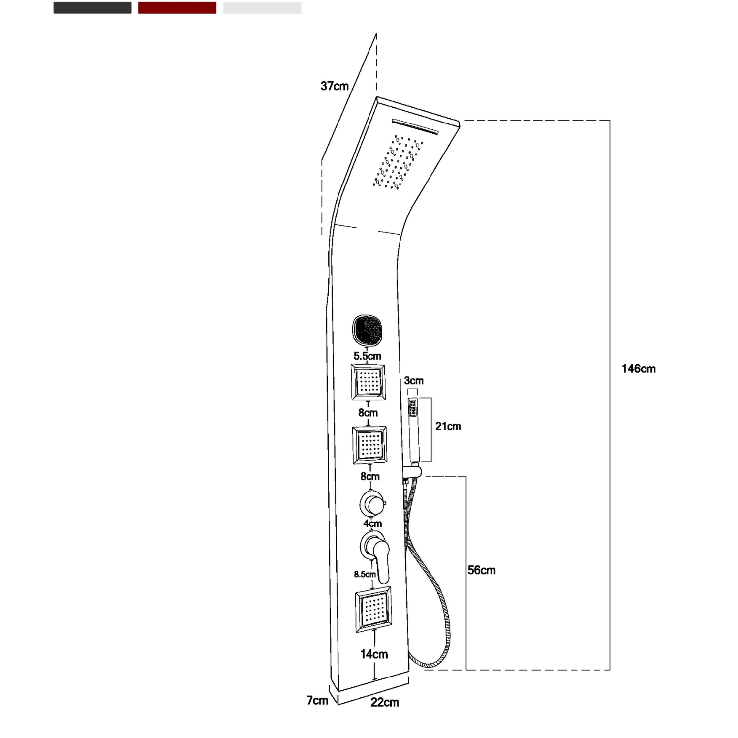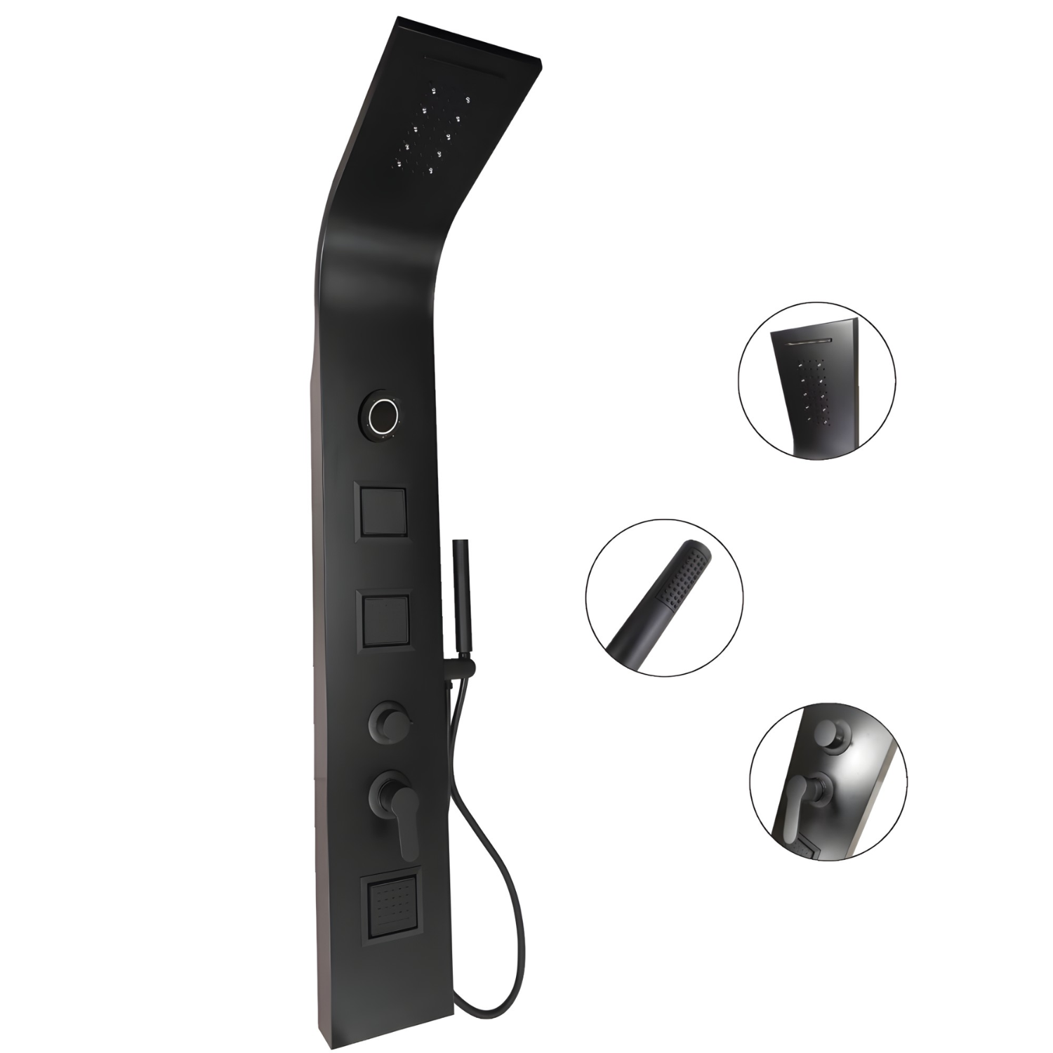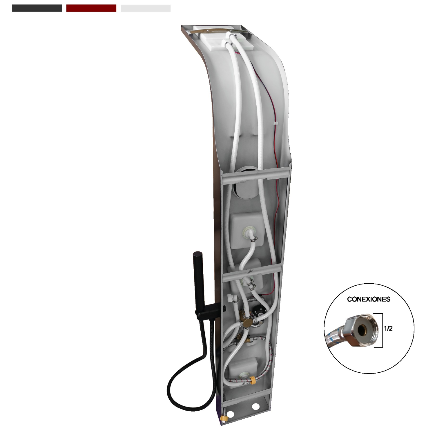 La Torre Ducha para baño con luz LED y Bluetooth en color negro combina diseño moderno y funcionalidad avanzada. Fabricada con acero resistente y conectores de latón, soporta altas temperaturas y es fácil de limpiar gracias a su acabado antioxidante. Su montaje en pared incluye todos los accesorios necesarios y conexiones para agua fría y caliente. Equipado con mandos cromados de alta gama, ofrece una experiencia de ducha personalizable, integrando iluminación LED y tecnología Bluetooth para mayor confort y ambientación en tu baño. Ideal para remodelaciones que buscan innovación y durabilidad.